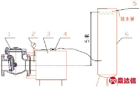 1.被测止回阀;2.100KPa低量程压力表;3.试压设备;4.注水球阀;5.浮球水控阀;6.开口储水罐